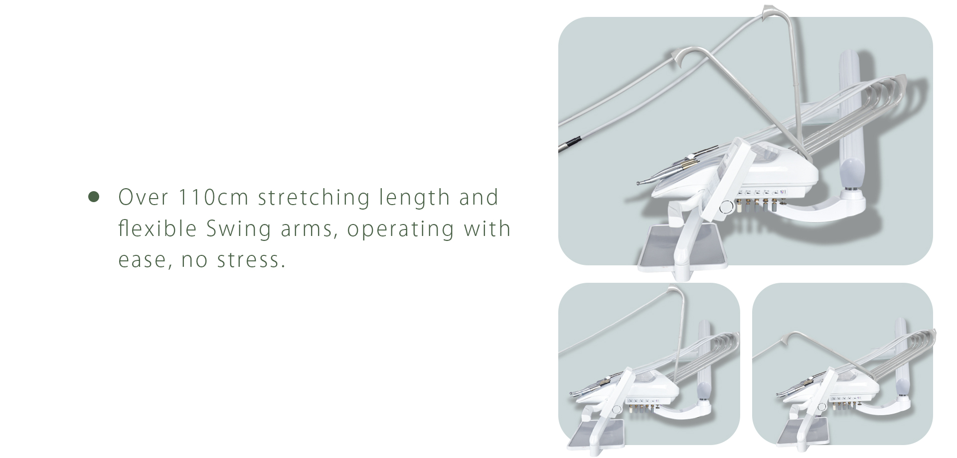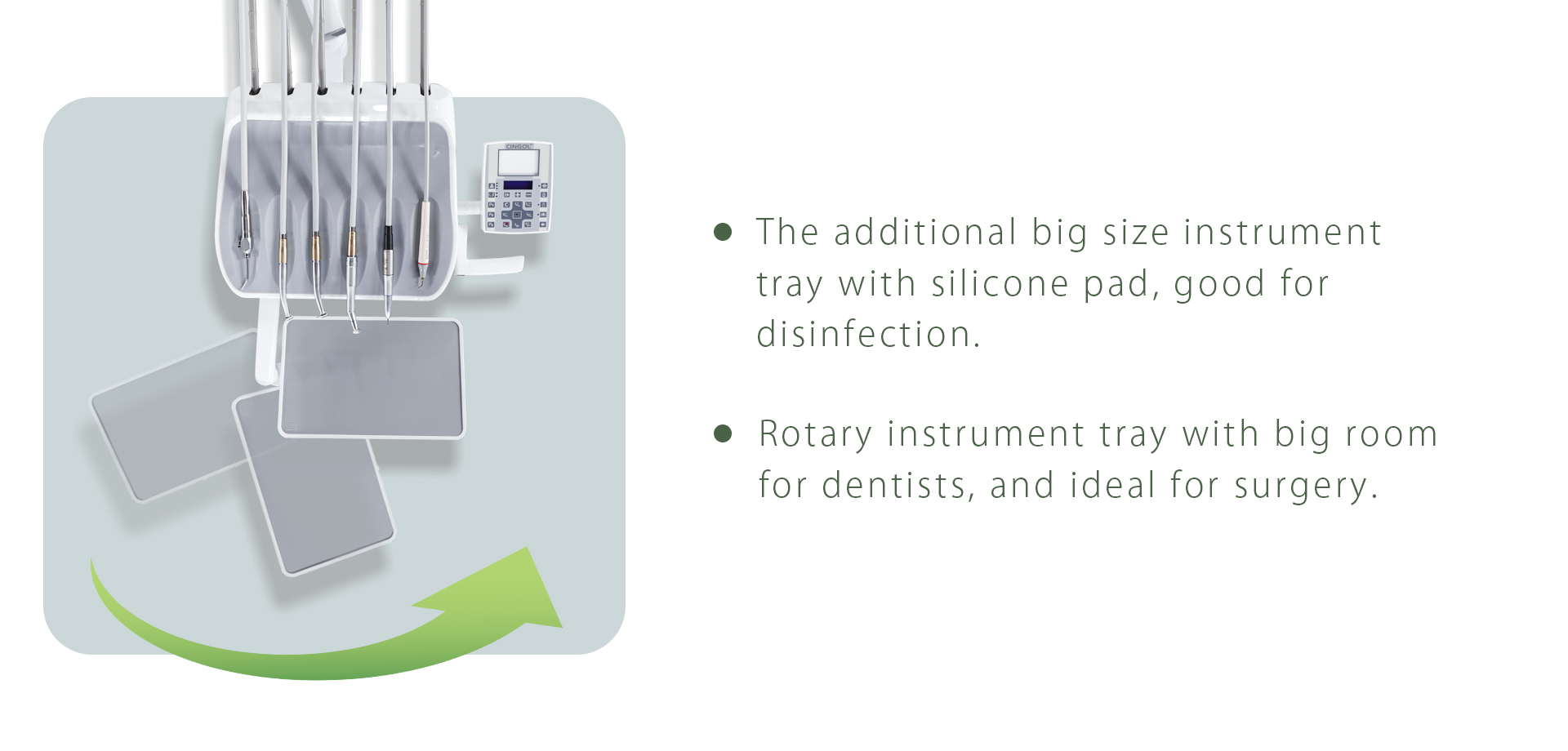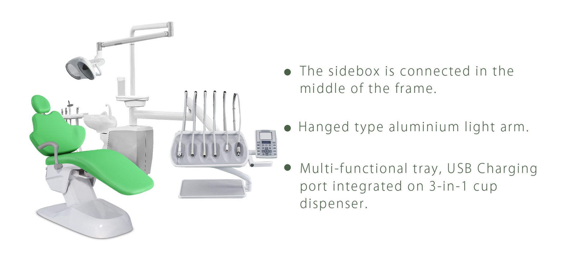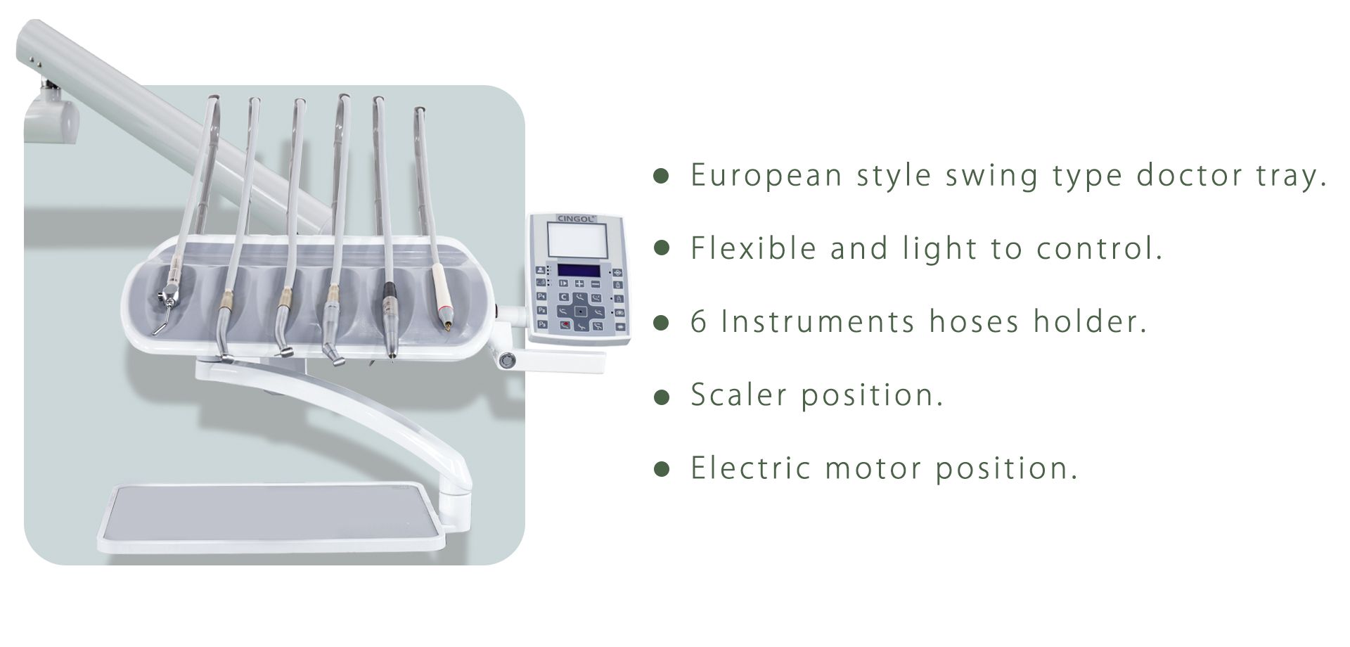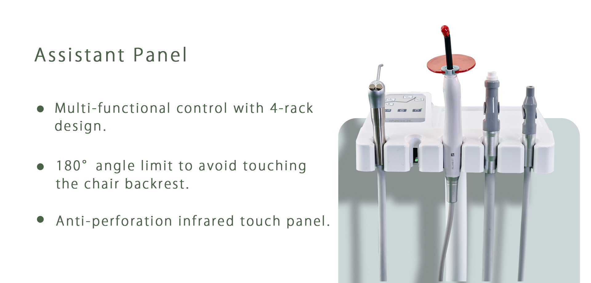 - Multi-functional Assistant Tray allows assistant to control chair position,cuspidor flushing ,water heating and cup filling.