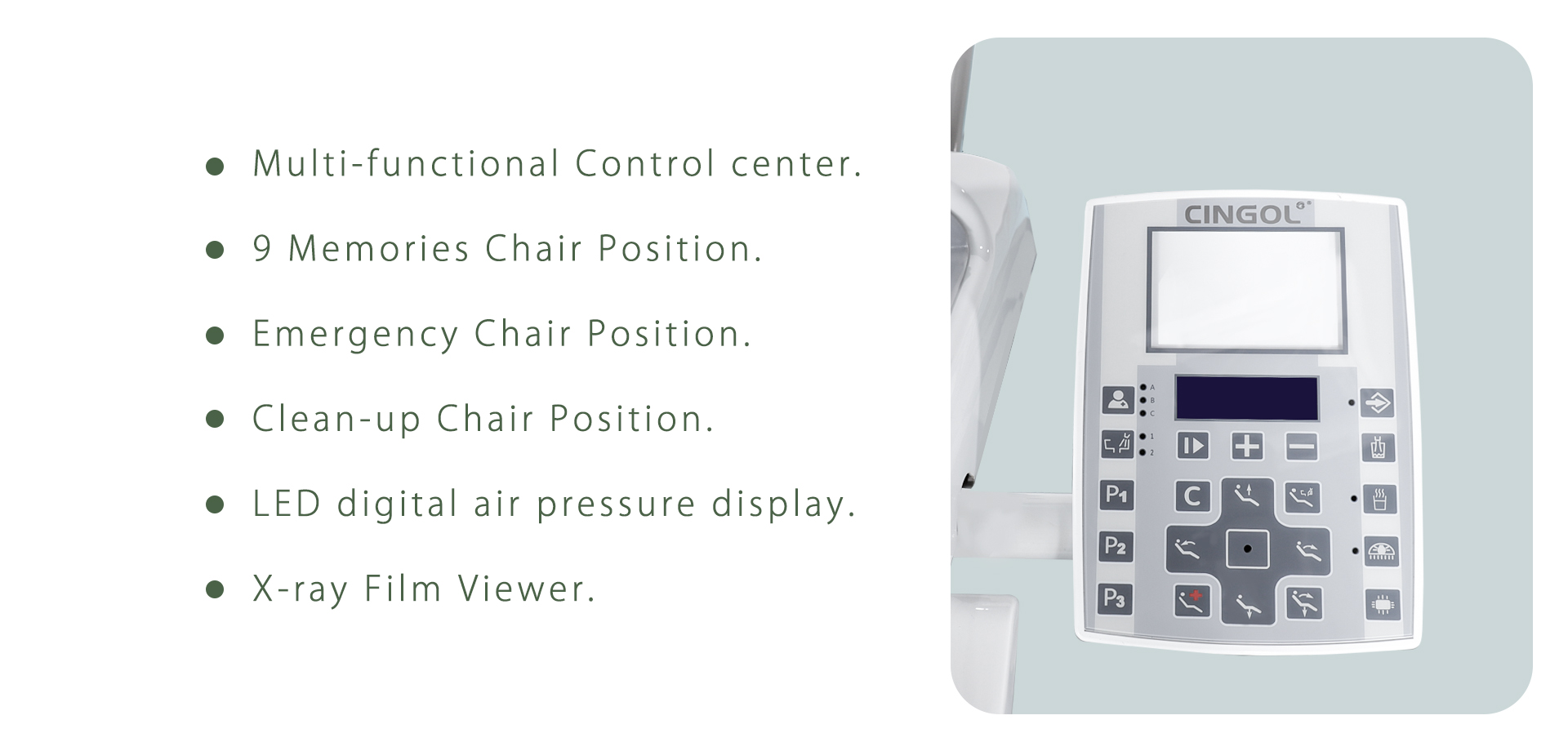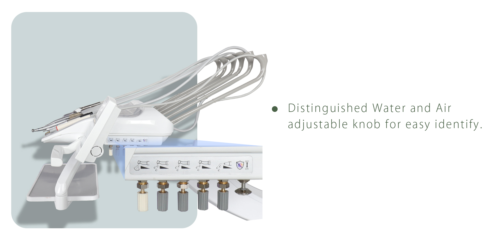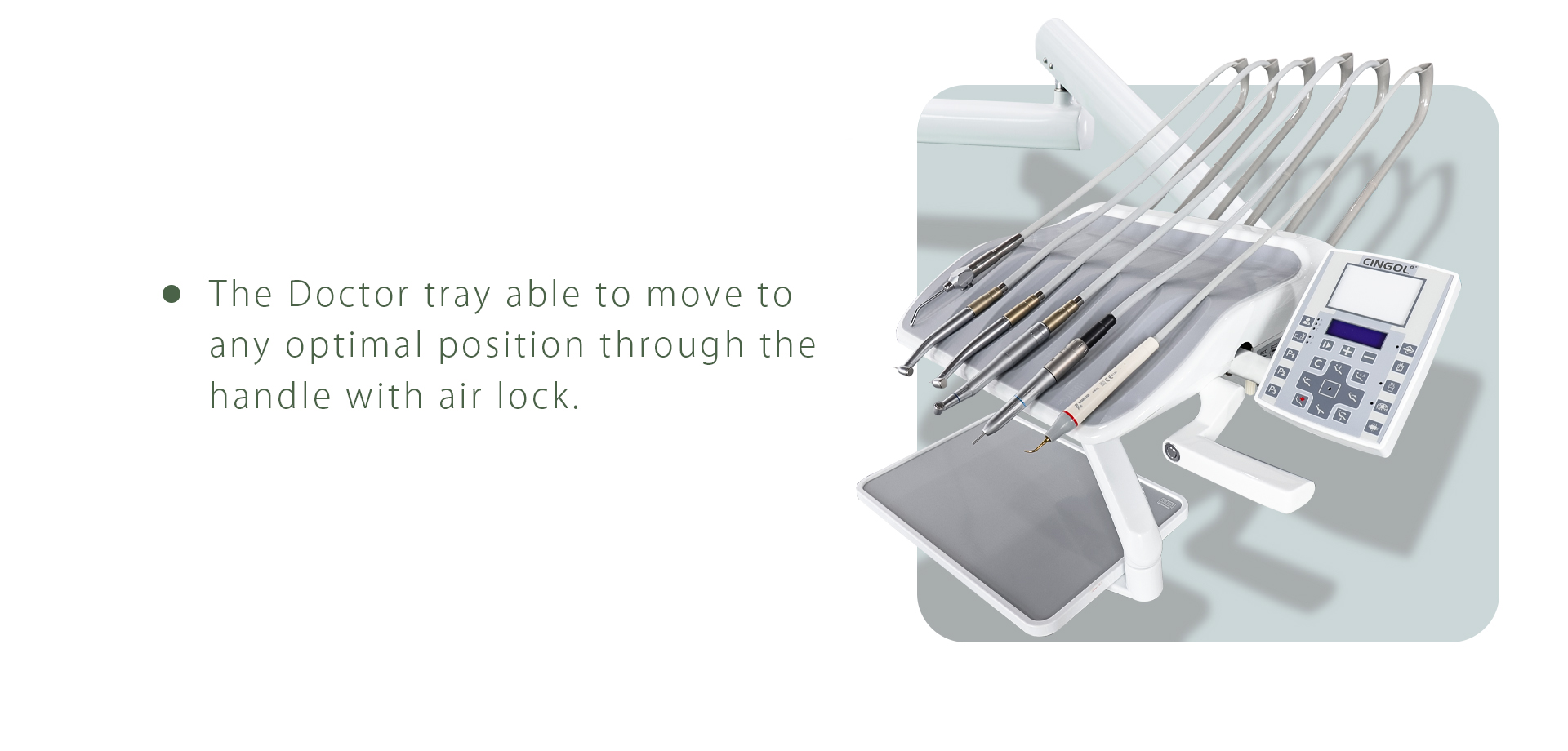 - Multi-functional Assistant Tray allows assistant to control chair position,cuspidor flushing ,water heating and cup filling.