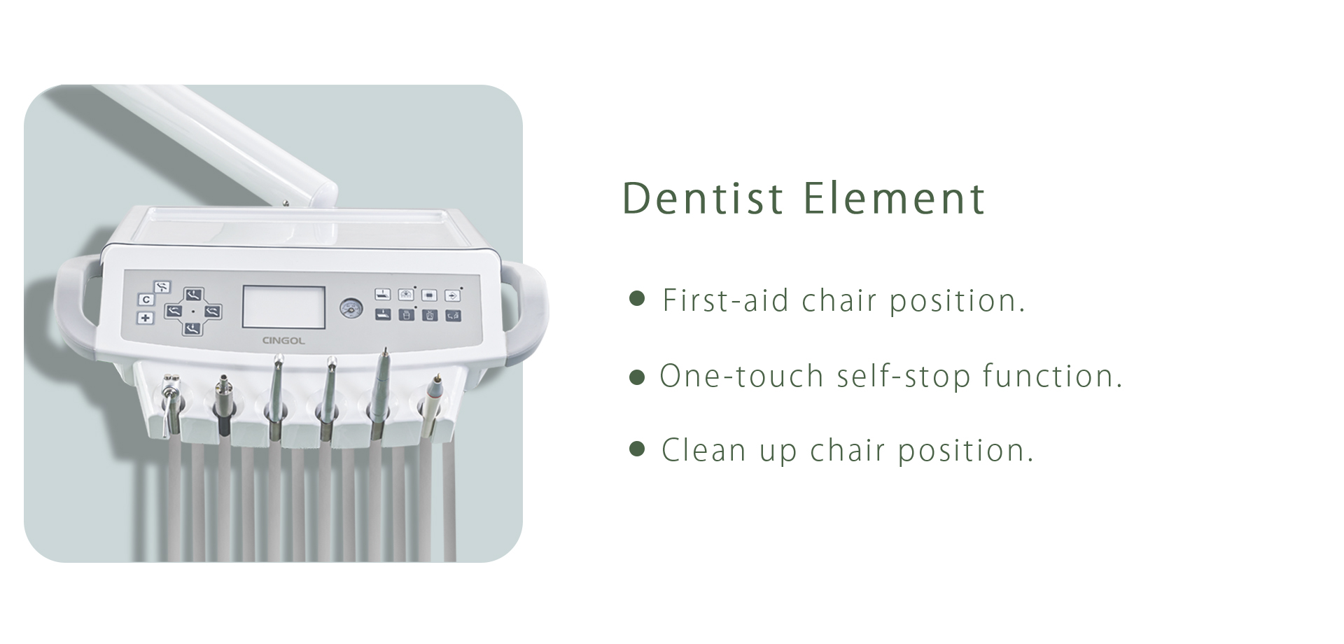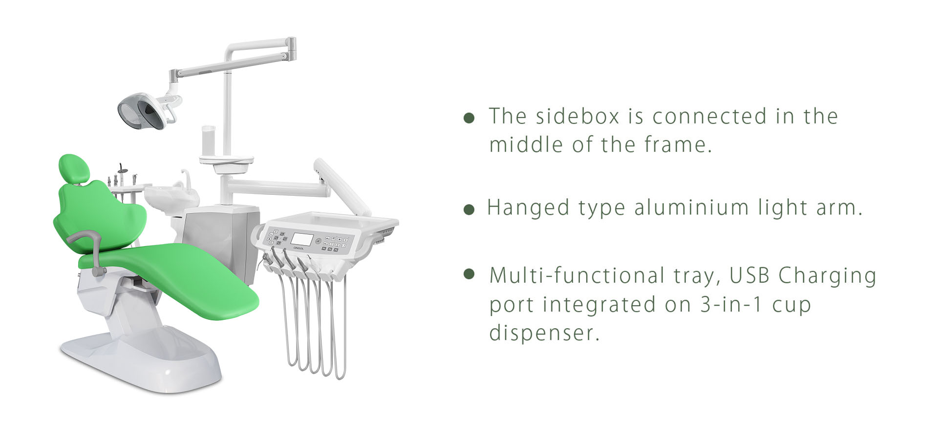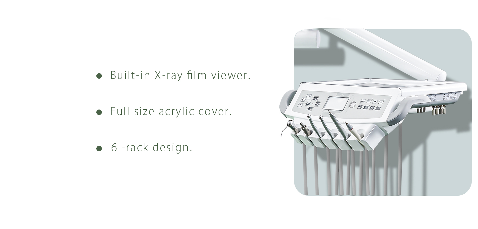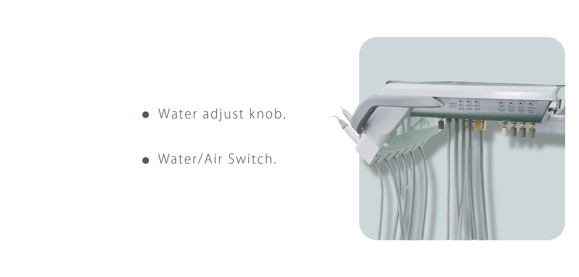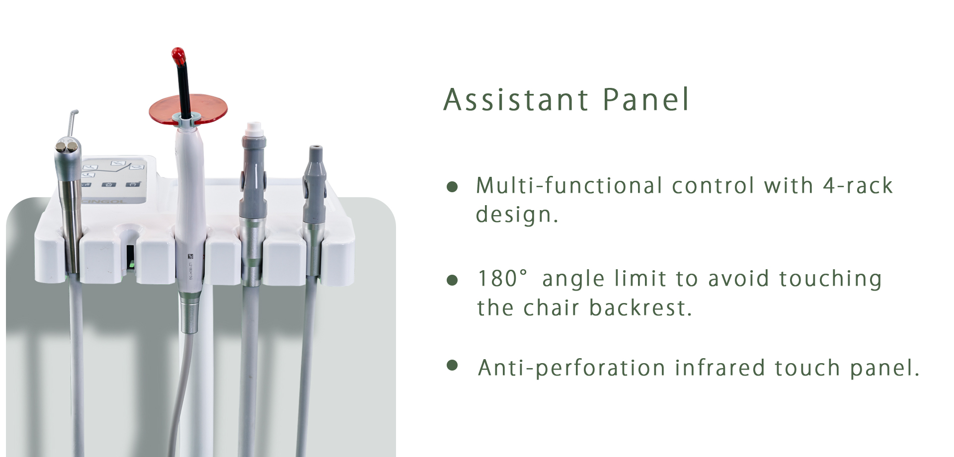 - Multi-functional Assistant Tray allows assistant to control chair position,cuspidor flushing ,water heating and cup filling.