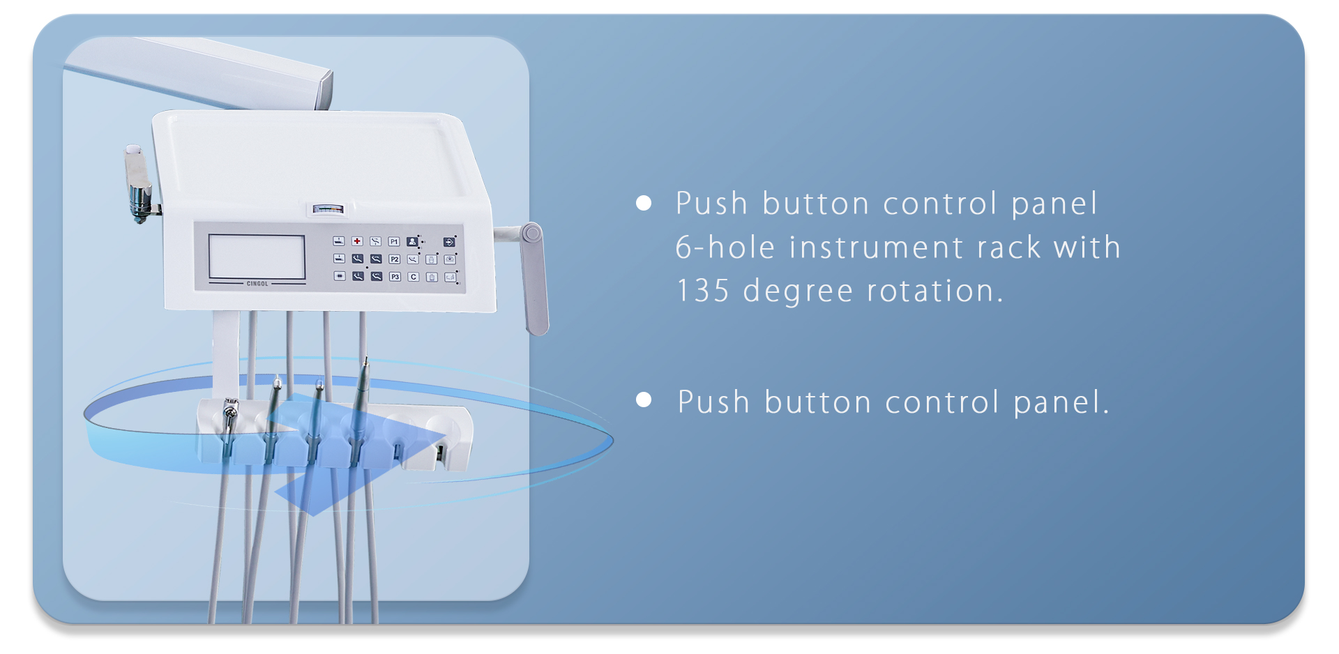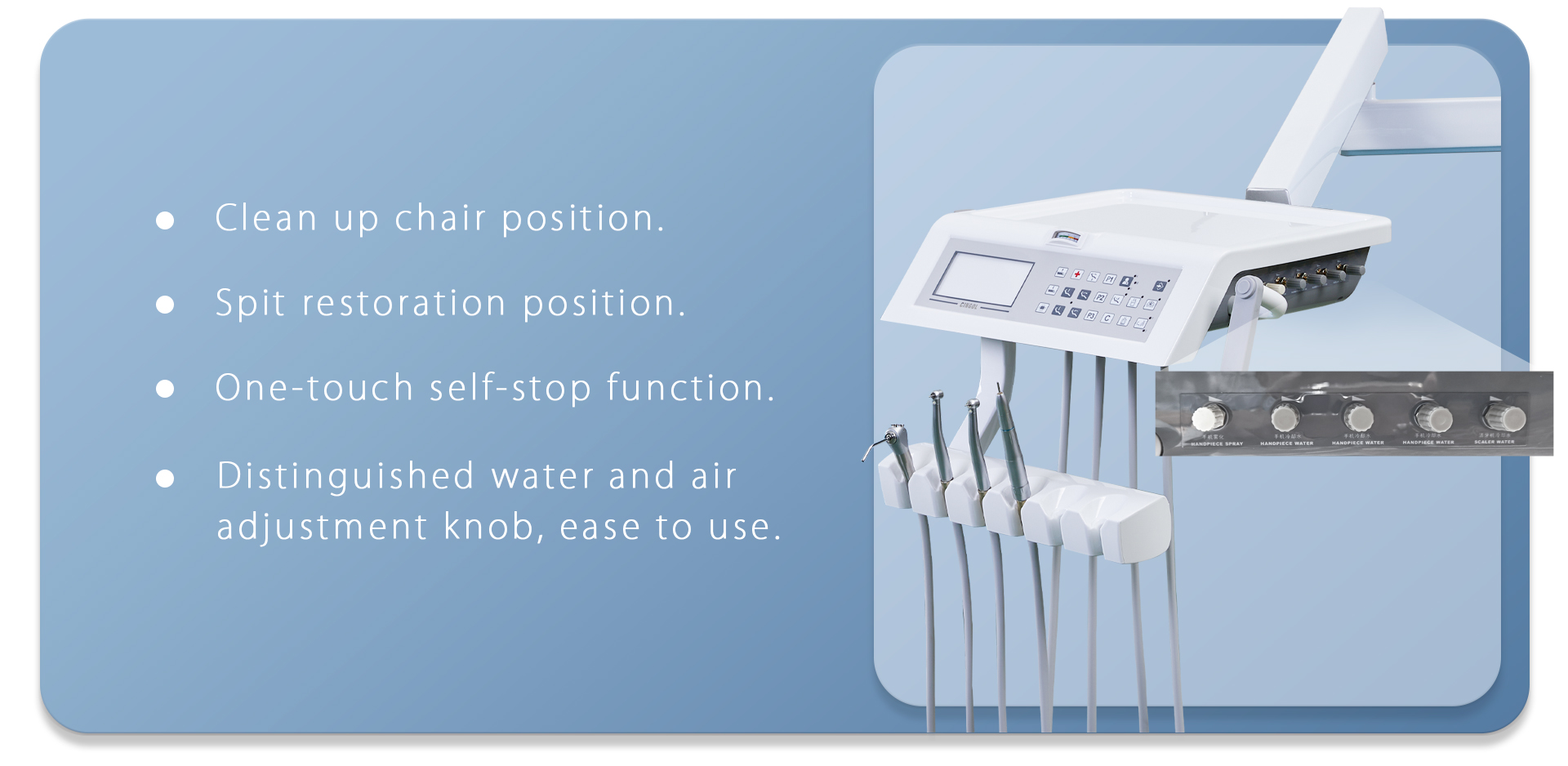 Automatically, the chair will be raised to highest position, cuspidor flushing,LED operation light off.